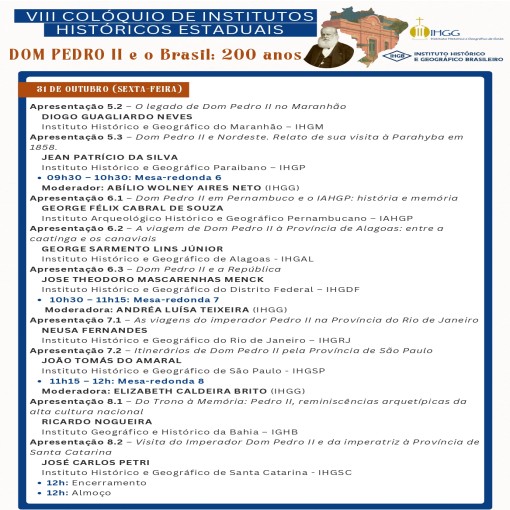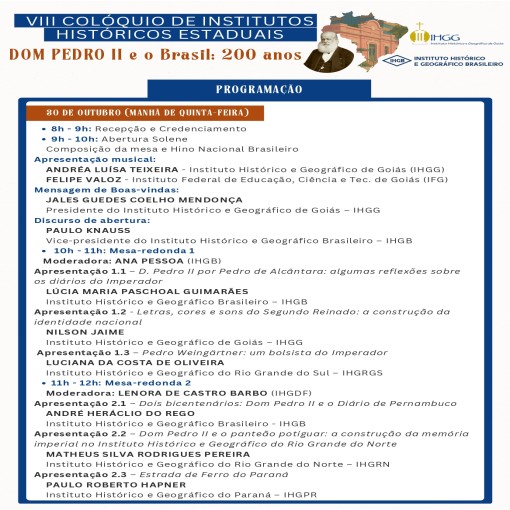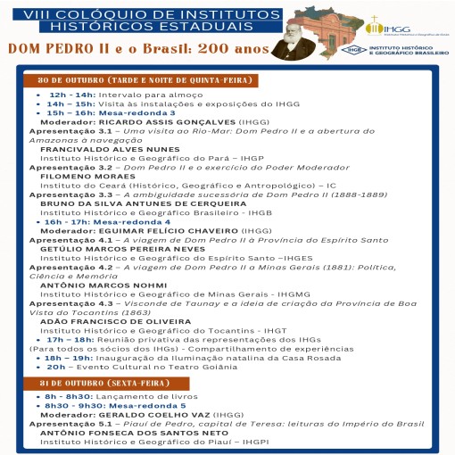 O IHGB realiza, desde 2014, colóquios que reúnem os institutos históricos estaduais brasileiros para valorizar a pluralidade das experiências regionais na construção do Brasil. A iniciativa promove o fortalecimento do Sistema Nacional de Institutos Históricos, coordenado pelo IHGB. A atividade é dirigida a estudantes universitários, pesquisadores e profissionais.